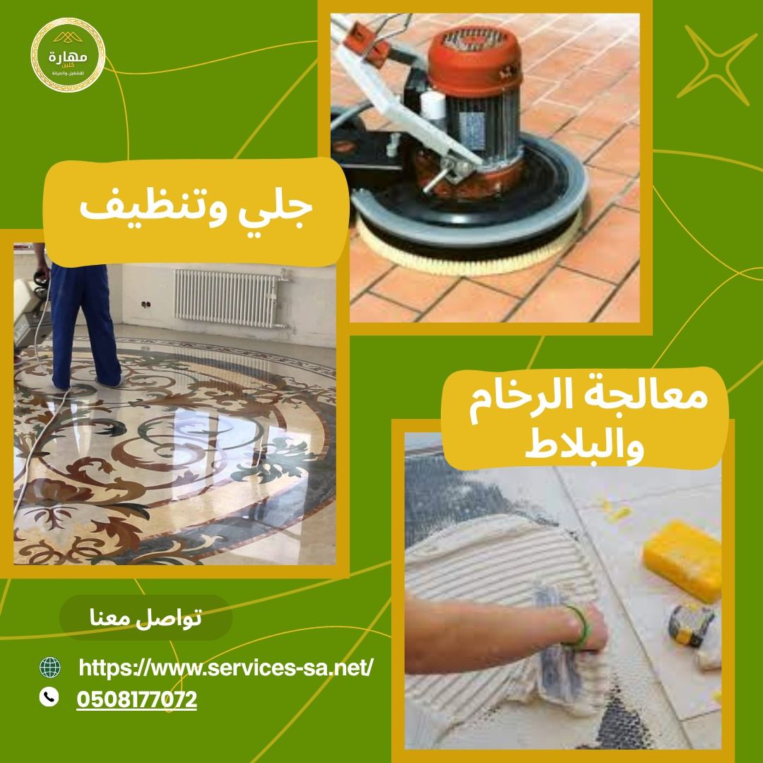 افضل خدمة جلي للأرضيات بالرياض- مهارة كلين تُعد مهارة كلين واحدة من الشركات الرائدة والمتخصصة في جلي وتنظيف ومعالجة الرخام والبلاط بمدينة الرياض، حيث تمتلك خبرة طويلة وإنجازات في هذا المجال.