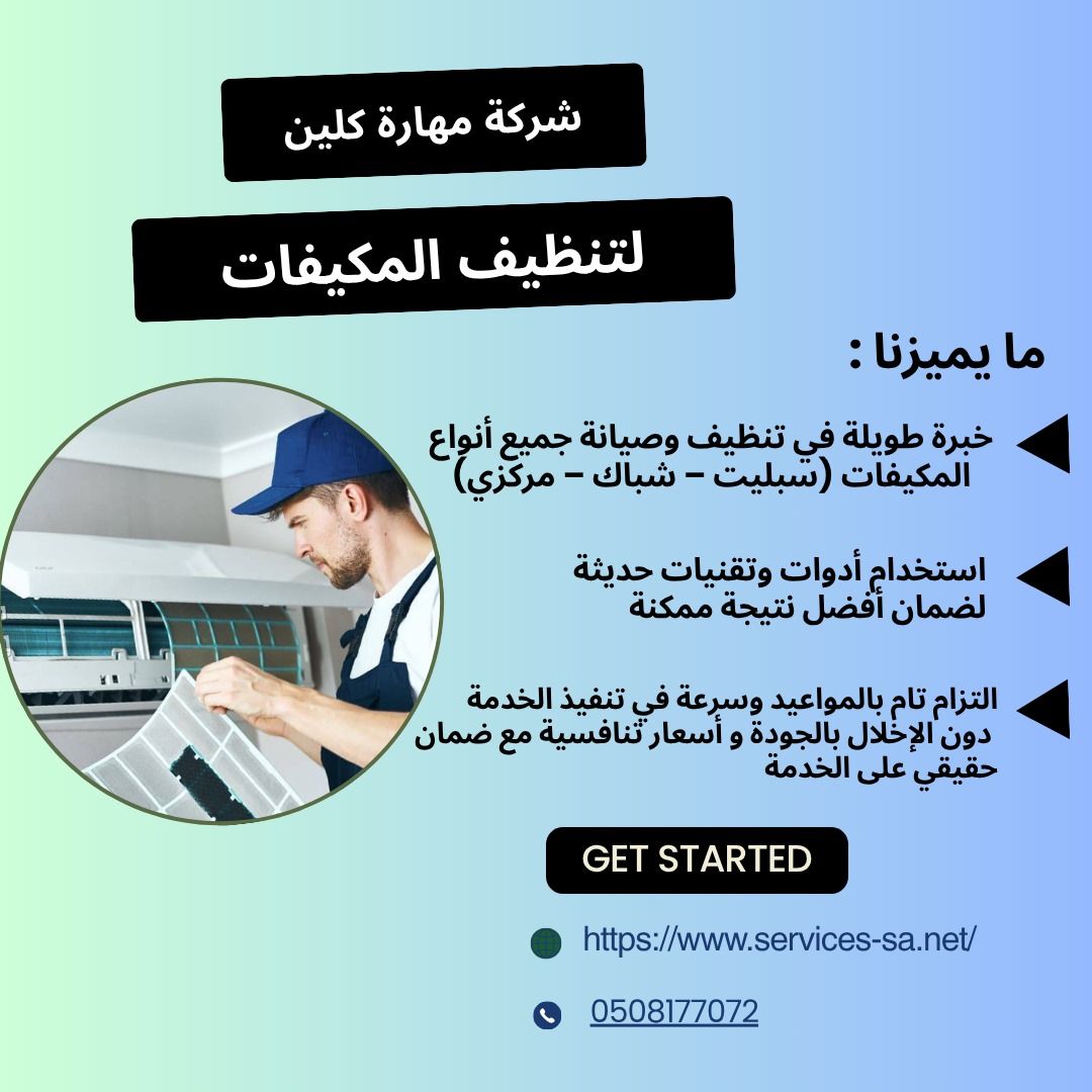 افضل شركة تنظيف مكيفات بالرياض تُعد شركة مهارة كلين من أبرز الشركات المتخصصة في تنظيف وصيانة المكيفات بمدينة الرياض، حيث نقدم خدمات متكاملة وشاملة تشمل:
